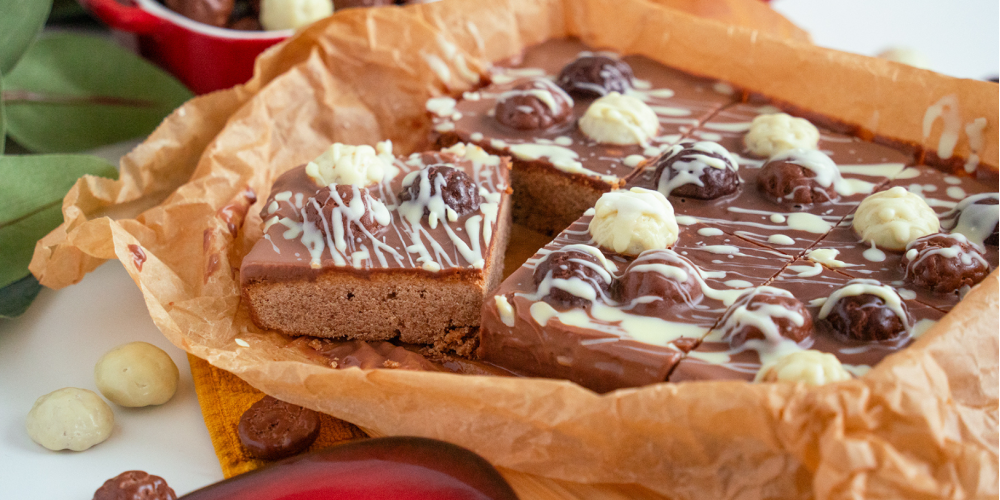 - Giet de chocolade ganache vervolgens in de bakvorm, over de koekbodem.. Versier de koek kort daarna met de chocolade kruidnoten, dan blijven die gelijk mooi op hun plek wanneer de ganache wat meer opstijft. Schat hierbij eventueel al in hoe je later de stukken wilt gaan snijden, het is namelijk makkelijker om niet door de kruidnoten heen te hoeven snijden!